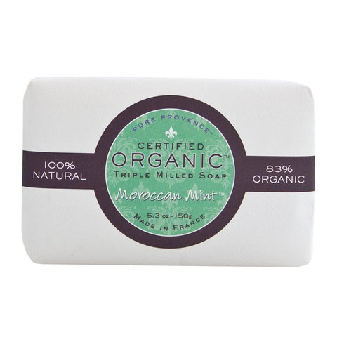 Pure Provence Vegetable Soap 5.3 Oz. - Moroccan Mint is a natural, vegetable soap made in the South of France crafted by an age-old process using only the finest ingredients. Free of any preservatives, colorants, or chemicals and blended with essential oils or natural fragrance coming from botanicals grown in the region. Certified organic Shea Butter is added to leave your skin nourished and moisturized. Triple milled to ensure a long lasting bar with a luxurious lather. No BHT, SLS, Parabens, or Phthalates. Cruelty-free, Ethically sourced, and Fair trade. Product Materials are Plastic-free and Vegan. Packaging is Plastic-free and Recyclable. 100% Natural. 83% Organic.